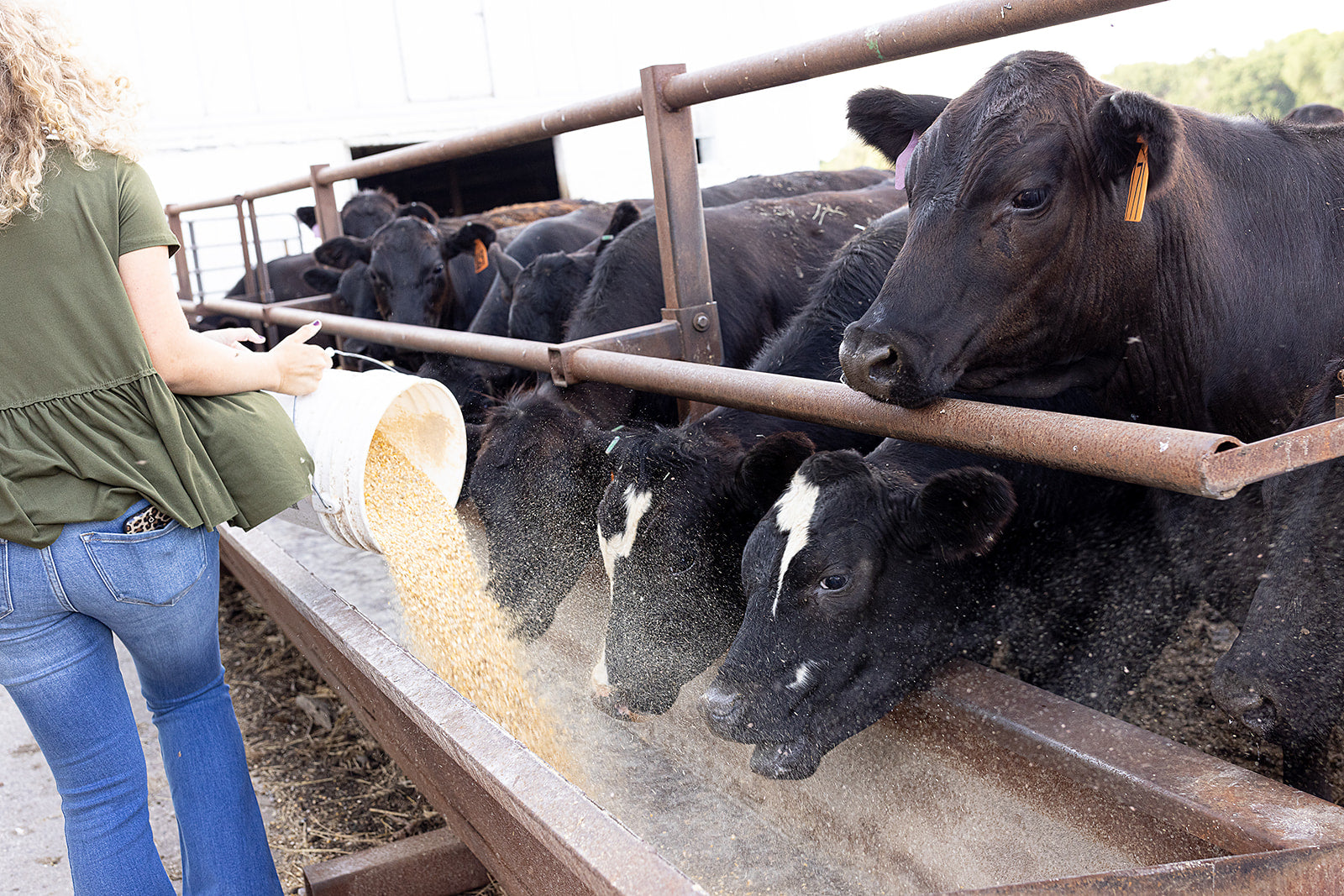 Our cattle are fed twice daily with a carefully balanced grain ration that includes cracked corn, distillers grains, and minerals in addition to hay developed alongside an animal nutritionist to support animal health and produce a high-quality, nutrient-dense beef product.
